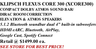 RADIOCRAFTS Proudly Canadian owned and operated Since 1941 KLIPSCH FLEXUS CORE 100 XCORE100 COMPACT DOLBY ATMOS SOUND BAR 2.1 Bluetooth soundbar Retail @ $549.00 ea. Sale Price: $499.00 ea. December 19, 2025- January 1, 2026 Flexus-Core-100-Spec-Sheet-v08.pdf Flexus-Core-200-Spec-Sheet-v08 (1).pdf KLIPSCH FLEXUS CORE 200 (XCORE200) COMPACT DOLBY ATMOS SOUND BAR/ WITH ELEVATION SPEAKERS 3.1.2 Bluetooth soundbar dual 4” built-in subwoofers Retail @ $749.00 ea. Sale Price: $699.00 ea. December 19, 2025- January 1, 2026 Flexus-Surr-100-Spec-Sheet-v06.pdf KLIPSCH FLEXUS SURR 100 XSURR100 SURROUND SPEAKERS Works with all Flexus products Retail @ $399.00 /PAIR SEE STORE FOR BEST PRICE! KLIPSCH FLEXUS SUB 100  XSUB100 10” SUBWOOFER Compatible with all XCORE products Retail @ $449.00 ea. SEE STORE FOR BEST PRICE! Flexus-Sub-100-Spec-Sheet-v06.pdf IN STOCK IN STOCK Flexus-Core-300-Spec-Sheet-v03b.pdf XCORE SUBWOOFER XCORE SURROUNDS RADIOCRAFTS XCORE SERIES IN STOCK IN STOCK