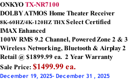 RADIOCRAFTS Proudly Canadian owned and operated Since 1941 TX-RZ70_Spec-Sheet_v01b.pdf ONKYO TX-RZ70 DOLBY ATMOS Home Theater Receiver  8K-60HZ/4K-120HZ THX Select Certified IMAX Enhanced 140W RMS 11.4 Channel, Powered Zone 2 & 3 Wireless Networking, Bluetooth & Airplay 2 Retail @ $4199.99 ea.  3 Year Warranty SEE STORE FOR BEST PRICE! TX-NR7100_US.pdf IN STOCK TX-RZ50.pdf IN STOCK AVRX3800H_NA_EN.pdf IN STOCK MARANTZ CINEMA 30 DOLBY ATMOS  Home Theater Receiver 8K-60HZ/4K-120HZ  140W RMS  11.4 Channel, 13 Channel Pre-out Monoblock, Built in streaming HEOS, Bluetooth & Airplay 2 IMAX, Amazon/Alexa Retail @ $6200.00 ea.  5 Year Warranty 623221_Marantz_Infosheet_CINEMA 30_121823.pdf MZ_Cinema 40_Infosheet_EU.pdf MARANTZ CINEMA 40 DOLBY ATMOS  Home Theater Receiver 8K-60HZ/4K-120HZ  125W RMS  9.4 Channel, 11 Channel Pre-out Built in streaming HEOS, Bluetooth & Airplay 2 IMAX, Amazon/Alexa Retail @ $4800.00 ea.  5 Year Warranty MARANTZ CINEMA 50 DOLBY ATMOS  Home Theater Receiver 8K-60HZ/4K-120HZ  110W RMS 9.4 Channel Built in streaming HEOS, Bluetooth & Airplay 2 IMAX, Amazon/Alexa Retail @ $3500.00 ea.  5 Year Warranty Marantz-Cinema-50-Infosheet.pdf IN STOCK MARANTZ CINEMA 60 DOLBY ATMOS  Home Theater Receiver 8K-60HZ/4K-120HZ  100W RMS 7.2 Channel Built in streaming HEOS, Bluetooth & Airplay 2 Amazon/Alexa Retail @ $2300.00 ea.  5 Year Warranty Marantz-Cinema-60-Infosheet.pdf IN STOCK MARANTZ STEREO 70s DOLBY ATMOS  Slim line Stereo Receiver 75W RMS 2.2 Channel, HDMI Built in streaming HEOS Bluetooth & Airplay 2 Retail @ $1299.00 ea.  5 Year Warranty MARANTZ CINEMA 70s DOLBY ATMOS  Home Theater Receiver 8K-60HZ/4K-120HZ , 50W RMS 7.2 Channel Built in streaming HEOS, Bluetooth & Airplay 2 Amazon/Alexa Retail @ $1700.00 ea.  5 Year Warranty Marantz-CINEMA-70s-Infosheet.pdf IN STOCK stereo 70s spec sheet.pdf IN STOCK DN__AVR-X2800H_InfoSheet_07092022.pdf DENON AVR-X2800H DOLBY ATMOS Home Theater Receiver 8K-60HZ/4K-120HZ  95W RMS 7.2 Channel, Powered Zone 2  Wireless Networking, Bluetooth & Airplay 2 Retail @ $1649.00 ea.  3 Year Warranty Sale Price: $1349.00 ea. December 24, 2025- January 1, 2026 IN STOCK DENON AVR-S670H DOLBY AUDIO Home Theater Receiver 8K-60HZ/4K-120HZ  75W RMS 5.2 Channel Wireless Networking, Bluetooth & Airplay 2 Retail @ $699.00 ea.  2 Year Warranty avr-s670h-infosheet-na-en.pdf IN STOCK DENON AVR-X1800H DOLBY ATMOS Home Theater Receiver 8K-60HZ/4K-120HZ  80W RMS 7.2 Channel, Powered Zone 2  Wireless Networking, Bluetooth & Airplay 2 Retail @ $1099.00 ea.  3 Year Warranty Sale Price: $825.00 ea. December 24, 2025- January 1, 2026 AVR-X1800H spec sheet.pdf IN STOCK DENON AVR-A10H DOLBY ATMOS Home Theater Receiver 8K-60HZ/4K-120HZ IMAX Enhanced Mono Block Design, 150W RMS 13.4 Channel, Powered Zone 2 & 3 Wireless Networking, Bluetooth & Airplay 2 Retail @ $6679.00 ea.  3 Year Warranty Denon_Infosheet_AVR-A10H.pdf Denon AVR-X4800H – Infosheet.pdf Denon AVR-A1H – Infosheet.pdf DENON AVR-A1H DOLBY ATMOS Home Theater Receiver 8K-60HZ/4K-120HZ IMAX Enhanced Mono Block Design, 150W RMS 15.4 Channel, Powered Zone 2 & 3 Wireless Networking, Bluetooth & Airplay 2 Retail @ $9399.00 ea.  3 Year Warranty IN STOCK DENON AVR-X6800H DOLBY ATMOS Home Theater Receiver 8K-60HZ/4K-120HZ IMAX Enhanced Mono Block Design, 140W RMS 11.4 Channel, Powered Zone 2 & 3 Wireless Networking, Bluetooth & Airplay 2 Retail @ $4699.00 ea.  3 Year Warranty Denon_AVR-X6800H_Black_Infosheet.pdf IN STOCK IN STOCK AV RECEIVERS RADIOCRAFTS dra-900h-info-sheet-na-en.pdf DENON DRA-900HNE AV Stereo Receiver 100W RMS 2.2 Channel Wireless Networking, Bluetooth & Airplay 2 Retail @ $999.00 ea.  2 Year Warranty TX-RZ50.pdf IN STOCK