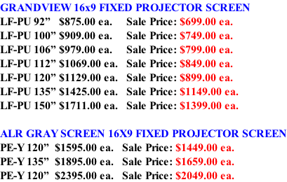GRANDVIEW 16x9 EDGE-X 12mm MICRO BEZEL SCREEN 4K  MATTE WHITE LF-PEX 106”    $1590.00 ea.   Sale Price: $1299.00 ea. LF-PEX  120”   $1945.00 ea.   Sale Price: $1599.00 ea. LF-PEX  135”   $2285.00 ea.   Sale Price: $1849.00 ea. GRANDVIEW 16x9 SHORT THROW ALR SCREEN (Ambient Light Rejection) PE-L 100”   $2489.00 ea.   Sale Price: $1899.00 ea. PE-L 120”   $4269.00 ea.   Sale Price: $3199.00 ea.