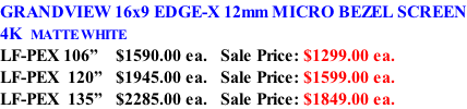 RADIOCRAFTS Proudly Canadian owned and operated Since 1941 GRANDVIEW 16x9 SHORT THROW ALR SCREEN (Ambient Light Rejection) PE-L 100”   $2489.00 ea.   Sale Price: $1899.00 ea. PE-L 120”   $4269.00 ea.   Sale Price: $3199.00 ea. GRANDVIEW 16x9 EDGE-X 12mm MICRO BEZEL SCREEN 4K  MATTE WHITE LF-PEX 106”    $1590.00 ea.   Sale Price: $1299.00 ea. LF-PEX  120”   $1945.00 ea.   Sale Price: $1599.00 ea. LF-PEX  135”   $2285.00 ea.   Sale Price: $1849.00 ea. RADIOCRAFTS