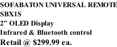 m.RADIOCRAFTS SOFABATON UNIVERSAL REMOTE SBU2 1.3” OLED Display Infrared & Bluetooth control  Retail @ $119.99 ea. Sale Price: $99.99 ea. SOFABATON UNIVERSAL REMOTE SBX1S 2” OLED Display Infrared & Bluetooth control  Retail @ $299.99 ea. IN STOCK IN STOCK