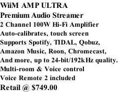m.RADIOCRAFTS Mail: radiocrafts@shaw.ca m.RADIOCRAFTS HOME ABOUT US ABOUT US WiiM MINI Wireless Audio Streamer Supports Apple Airplay 2, Spotify Connect, TIDAL Connect, Amazon Music Cast, DLNA, Hi-Res, lossless audio, multiroom audio. Retail @ $139.00 WiiM PRO Audiophile-grade Streamer digital and analog audio outputs supports Apple AirPlay 2, Google Chromecast, Alexa Music Cast, DLNA, Spotify Connect, TIDAL Connect, Hi-Res lossless, and multiroom audio. Retail @ $219.00 WiiM PRO PLUS Audio Streamer audiophile-grade music streamer, digital and analog audio outputs Supports Apple AirPlay 2, Google Chromecast, Alexa Music Cast, DLNA, Spotify Connect, TIDAL Connect, Hi-Res lossless & multiroom audio. Retail @ $319.00 WiiM AMP Streaming Amplifier Class D, 2 Channel,  60W/ch @ 8 ohms & 120W @ 4 ohms Hi-Res up to 24-bit/ 192 kHz Supports Google cast, Airplay 2, Alexa, Multiroom, ethernet & Spotify Includes Voice Remote Retail @ $449.00 WiiM AMP PRO Streaming Amplifier Class D, 2 Channel  24-bit/192 kHz, Supports Spotify, Amazon Music, TIDAL, Qobuz 60W/ch @ 8 ohms & 120W @ 4 ohms Incompatible with AirPlay Retail @ $549.00 WiiM VIBELINK Integrated Amplifier 100W/ch @ 8ohms or 200W/ch @8ohms built-in ESS 9039Q2M DAC TI TPA3255 amplifier chip, Ultra-low distortion and noise high-resolution audio 192kHz/24-bit Retail @ $449.00 WiiM ULTRA Digital Hub Audio Streamer 32-bit/384kHz ES9038 Q2M SABRE DAC connects with turntables, TVs, headphones, AV receivers, subwoofers, smart speakers Bluetooth headsets, and more Touchscreen, supports top streaming services Retail @ $499.00 WiiM VOICE REMOTE Voice controlled remote Works with WiiM Mini or Pro devices 4 Customizable preset buttons 2x AAA Batteries required Retail @ $29.00 WiiM VOICE REMOTE 2 Voice controlled remote Intuitive control, smart functionality 4 Customizable preset buttons USB-C rechargeable battery Retail @ $59.00 IN STOCK IN STOCK