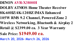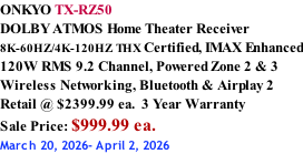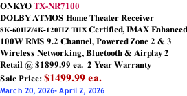 RADIOCRAFTS Proudly Canadian owned and operated Since 1941 Hours Of Operation: Monday - Saturday - 10:00am - 5:30pm MARANTZ CINEMA 30 DOLBY ATMOS  Home Theater Receiver 8K-60HZ/4K-120HZ  140W RMS  11.4 Channel, 13 Channel Pre-out Monoblock, Built in streaming HEOS, Bluetooth & Airplay 2 IMAX, Amazon/Alexa Retail @ $6200.00 ea.  5 Year Warranty 623221_Marantz_Infosheet_CINEMA 30_121823.pdf MZ_Cinema 40_Infosheet_EU.pdf MARANTZ CINEMA 40 DOLBY ATMOS  Home Theater Receiver 8K-60HZ/4K-120HZ  125W RMS  9.4 Channel, 11 Channel Pre-out Built in streaming HEOS, Bluetooth & Airplay 2 IMAX, Amazon/Alexa Retail @ $4800.00 ea.  5 Year Warranty MARANTZ CINEMA 50 DOLBY ATMOS  Home Theater Receiver 8K-60HZ/4K-120HZ  110W RMS 9.4 Channel Built in streaming HEOS, Bluetooth & Airplay 2 IMAX, Amazon/Alexa Retail @ $3500.00 ea.  5 Year Warranty Marantz-Cinema-50-Infosheet.pdf IN STOCK MARANTZ CINEMA 60 DOLBY ATMOS  Home Theater Receiver 8K-60HZ/4K-120HZ  100W RMS 7.2 Channel Built in streaming HEOS, Bluetooth & Airplay 2 Amazon/Alexa Retail @ $2300.00 ea.  5 Year Warranty Marantz-Cinema-60-Infosheet.pdf IN STOCK MARANTZ STEREO 70s DOLBY ATMOS  Slim line Stereo Receiver 75W RMS 2.2 Channel, HDMI Built in streaming HEOS Bluetooth & Airplay 2 Retail @ $1299.00 ea.  5 Year Warranty MARANTZ CINEMA 70s DOLBY ATMOS  Home Theater Receiver 8K-60HZ/4K-120HZ , 50W RMS 7.2 Channel Built in streaming HEOS, Bluetooth & Airplay 2 Amazon/Alexa Retail @ $1700.00 ea.  5 Year Warranty Marantz-CINEMA-70s-Infosheet.pdf IN STOCK stereo 70s spec sheet.pdf IN STOCK AV RECEIVERS MARANTZ AV10 AV PreAmp Processor 8K-60HZ/4K-120HZ, 15.4 Channel Built in streaming HEOS, Bluetooth & Airplay 2 IMAX, Amazon/Alexa Retail @ $11,000.00 ea.  5 Year Warranty MARANTZ AV20 AV PreAmp Processor 8K-60HZ/4K-120HZ, 13.4 Channel Built in streaming HEOS, Bluetooth & Airplay 2 IMAX, Amazon/Alexa Retail @ $8000.00 ea.  5 Year Warranty av10-technical-specs.pdf Marantz_AV7706_ProductInfosheet_EU.pdf MARANTZ AV7706 HD AV PreAmp Processor 8K-60HZ/4K-120HZ , 11.2 Channel Built in streaming HEOS, Bluetooth & Airplay 2 IMAX, Amazon/Alexa Retail @ $4199.00 ea.  3 Year Warranty Marantz_Infosheet_AV 30.pdf MARANTZ AV30 AV PreAmp Processor 8K-60HZ/4K-120HZ, 11.4 Channel Built in streaming HEOS, Bluetooth & Airplay 2 IMAX, Amazon/Alexa Retail @ $5,000.00 ea.  5 Year Warranty DN__AVR-X2800H_InfoSheet_07092022.pdf DENON AVR-X2800H DOLBY ATMOS Home Theater Receiver 8K-60HZ/4K-120HZ  95W RMS 7.2 Channel, Powered Zone 2  Wireless Networking, Bluetooth & Airplay 2 Retail @ $1649.00 ea.  3 Year Warranty Sale Price: $1349.00 ea. March 20, 2026- March 26, 2026 IN STOCK DENON AVR-A10H DOLBY ATMOS Home Theater Receiver 8K-60HZ/4K-120HZ IMAX Enhanced Mono Block Design, 150W RMS 13.4 Channel, Powered Zone 2 & 3 Wireless Networking, Bluetooth & Airplay 2 Retail @ $6679.00 ea.  3 Year Warranty Denon_Infosheet_AVR-A10H.pdf DENON AVR-S670H DOLBY AUDIO Home Theater Receiver 8K-60HZ/4K-120HZ  75W RMS 5.2 Channel Wireless Networking, Bluetooth & Airplay 2 Retail @ $699.00 ea.  2 Year Warranty avr-s670h-infosheet-na-en.pdf Denon AVR-X4800H – Infosheet.pdf DENON AVR-X4800H DOLBY ATMOS Home Theater Receiver 8K-60HZ/4K-120HZ IMAX Enhanced Mono Block Design, 125W RMS 9.4 Channel, Powered Zone 2 & 3 Wireless Networking, Bluetooth & Airplay 2 Retail @ $3599.00 ea.  3 Year Warranty avr-x3800h-info-sheet-en.pdf IN STOCK Denon AVR-A1H – Infosheet.pdf DENON AVR-A1H DOLBY ATMOS Home Theater Receiver 8K-60HZ/4K-120HZ IMAX Enhanced Mono Block Design, 150W RMS 15.4 Channel, Powered Zone 2 & 3 Wireless Networking, Bluetooth & Airplay 2 Retail @ $9399.00 ea.  3 Year Warranty IN STOCK DENON AVR-X1800H DOLBY ATMOS Home Theater Receiver 8K-60HZ/4K-120HZ  80W RMS 7.2 Channel, Powered Zone 2  Wireless Networking, Bluetooth & Airplay 2 Retail @ $1099.00 ea.  3 Year Warranty AVR-X1800H spec sheet.pdf IN STOCK IN STOCK DENON AVR-X6800H DOLBY ATMOS Home Theater Receiver 8K-60HZ/4K-120HZ IMAX Enhanced Mono Block Design, 140W RMS 11.4 Channel, Powered Zone 2 & 3 Wireless Networking, Bluetooth & Airplay 2 Retail @ $4699.00 ea.  3 Year Warranty Denon_AVR-X6800H_Black_Infosheet.pdf IN STOCK RADIOCRAFTS dra-900h-info-sheet-na-en.pdf DENON DRA-900HNE AV Stereo Receiver 100W RMS 2.2 Channel Wireless Networking, Bluetooth & Airplay 2 Retail @ $999.00 ea.  2 Year Warranty TX-RZ70_Spec-Sheet_v01b.pdf ONKYO TX-RZ70 DOLBY ATMOS Home Theater Receiver  8K-60HZ/4K-120HZ THX Certified, IMAX Enhanced 140W RMS 11.4 Channel, Powered Zone 2 & 3 Wireless Networking, Bluetooth & Airplay 2 Retail @ $4199.99 ea.  3 Year Warranty SEE STORE FOR BEST PRICE! TX-NR7100_US.pdf IN STOCK TX-RZ50.pdf TX-NR6100_US.pdf ONKYO TX-NR6100 DOLBY ATMOS Home Theater Receiver  8K-60HZ/4K-120HZ THX Certified 100W RMS 7.2 Channel, Powered Zone 2 Wireless Networking, Bluetooth & Airplay 2 Retail @ $1299.99 ea.  2 Year Warranty Sale Price: $999.99 ea. March 20, 2026- April 2, 2026 IN STOCK IN STOCK