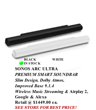 RADIOCRAFTS Proudly Canadian owned and operated Since 1941 Hours Of Operation: Monday - Saturday - 10:00am - 5:30pm SONOS SUB 4 PREMIUM WIRELESS SUBWOOFER Improved wireless connectivity Retail @ $1149.00 ea. SEE STORE FOR BEST PRICE! SONOS MINI SUB  BOLD BASS Wireless Retail @ $649.00 ea. SEE STORE FOR BEST PRICE! Sub Mini.pdf WHITE WHITE SONOS ROAM 2 PORTABLE SPEAKER Wireless Music Streaming, Airplay 2, Bluetooth, Google & Alexa Water proof, 10 Hour Battery Charge Retail @ $229.00 ea. SEE STORE FOR BEST PRICE! BLACK IN STOCK WHITE Era 100.pdf SONOS ERA 100 EFFORTLESS LISTENING, Bluetooth Wireless Music Streaming & Airplay 2, Alexa Retail @ $289.00 ea. SEE STORE FOR BEST PRICE! BLACK IN STOCK Beam (Gen 2).pdf SONOS BEAM 2 HIGH DEFINITION SOUND Dolby Atmos, Wireless Music Streaming Airplay 2, Google & Alexa Retail @ $649.00 ea. SEE STORE FOR BEST PRICE! BLACK IN STOCK Five.pdf SONOS Five STUDIO QUALITY Wireless Music Streaming & Airplay 2, Retail @ $779.00 ea. SEE STORE FOR BEST PRICE! WHITE BLACK SONOS BLACK IN STOCK Era 300.pdf SONOS ERA 300 EFFORTLESS LISTENING, Bluetooth Wireless Music Streaming & Airplay 2, Alexa Retail @ $629.00 ea. SEE STORE FOR BEST PRICE! WHITE BLACK IN STOCK SONOS ACE ACTIVE NOISE CANCELLING HEADPHONES 30 hour battery life Retail @ $549.00 ea. SEE STORE FOR BEST PRICE! BLACK WHITE IN STOCK WHITE Port.pdf SONOS PORT CONNECT EVERYTHING Wireless Music Streaming & Airplay 2, Retail @ $649.00 ea. SEE STORE FOR BEST PRICE! Amp.pdf SONOS AMP POWER EVERYTHING 125W/Ch Retail @ $1049.00 ea. SEE STORE FOR BEST PRICE! IN STOCK SONOS ROAM WIRELESS CHARGER Charge your portable speaker with this custom-designed magnetic wireless charger. Retail @ $69.00 ea. SEE STORE FOR BEST PRICE! IN STOCK SONOS LINE-IN ADAPTER CABLE 3.5mm to USB-C adapter Retail @ $24.99 ea. SEE STORE FOR BEST PRICE! SONOS ERA 100 WALL MOUNTS Retail @ $159.00 /PAIR SEE STORE FOR BEST PRICE! SONOS ERA 300 WALL MOUNTS Retail @ $179.00 /PAIR SEE STORE FOR BEST PRICE! SONOS BEAM MOUNT Retail @ $79.00 ea. SEE STORE FOR BEST PRICE! SANUS AMP MOUNT For Sonos Amp Retail @ $89.00 ea. SEE STORE FOR BEST PRICE! IN STOCK SONOS ARC ULTRA MOUNT Retail @ $89.00 ea. SEE STORE FOR BEST PRICE! IN STOCK SONOS ERA 100 SPEAKER STANDS SET OF TWO H - 35.5”, W - 10 Ibs Retail @ $349.00 /PAIR SEE STORE FOR BEST PRICE! SONOS ERA 300 SPEAKER STANDS H - 37.64”, W - 10.36 lbs Retail @ $379.00 /PAIR SEE STORE FOR BEST PRICE! IN STOCK BLACK IN STOCK IN STOCK IN STOCK IN STOCK SONOS PLAY PORTABLE SPEAKER Wireless Music Streaming, Bluetooth Airplay 2, Voice Control Water Proof & Drop-resistant  Bluetooth, 24 Hour Battery Life Includes Charging Base Retail @ $399.00 ea. WHITE SONOS MOVE 2 PORTABLE SPEAKER Wireless Music Streaming, Bluetooth Airplay 2, Google & Alexa,  Bluetooth, 24 Hour Battery Life Includes Charging Base Retail @ $649.00 ea. SEE STORE FOR BEST PRICE! WHITE BLACK IN STOCK BLACK IN STOCK