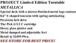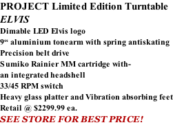 m.RADIOCRAFTS Elvis-Turntable-EN.pdf MetallicaLimitedEdition-EN.pdf belt replacement.PNG Debut EVO 2 Product Information.pdf PROJECT X8- B EVOLUTION Precision balanced, 5.1kg -  damped aluminum platter 9” Carbon tone arm Ortofon Quintet Blue cartridge Belt driven, 33/45 RPM Dust cover included  Available in Piano Black Retail @ $3699.99 ea. SEE STORE FOR BEST PRICE! X1_B_Information_Sheet.pdf PROJECT X1- B EVOLUTION Non-resonant Acryl platter 8.6” Carbon tone arm Pick it PRO mm cartridge Belt driven, 33/45 Dust cover included  Available in: Piano Black, Piano White, Walnut Retail @ $1599.99 ea. SEE STORE FOR BEST PRICE! X2-B-EN.pdf PROJECT X2- B EVOLUTION Non-resonant Acryl platter 8.6” Carbon tone arm Ortofon Quintet Red cartridge Belt driven, 33/45 Dust cover included  Available in: Piano Black, Satin Black, Satin White, Walnut Retail @ $2499.99 ea. SEE STORE FOR BEST PRICE! X8-Special-Edition-EN.pdf DEBUT ALUMINUM SUB PLATTER Precision machined out of aluminum Adds more mass and damps unwanted resonance's Increases speed accuracy, and short term speed stability   Retail @ $259.99 ea. SEE STORE FOR BEST PRICE! PROJECT ACRYL IT Acrylic with satinised surface Replaces the stock aluminum platter and mat Retail @ $229.99 ea. SEE STORE FOR BEST PRICE! PROJECT CORK & RUBBER IT High quality 1mm turntable mat made of a cork-rubber mix Avoids static load, fits all turntables Retail @ $39.99 ea. SEE STORE FOR BEST PRICE! THE Q UP Automatic tone arm lifter Retail @ $89.99 ea. VINYL COASTERS Includes holder  Selection varies Retail @ $19.99 ea. TIN COIN PURSE Multi Use Selection varies Retail @ $5.99 ea. IN STOCK IN STOCK IN STOCK SPIN-CLEAN Record Washer MK II 1x Bath unit 1x Pair of brushes 1x Pair of rollers 1x Washable drying cloths 1x 4 Oz. Washer fluid Retail @ $119.00 ea. SEE STORE FOR BEST PRICE! PROJECT PRE-AMP Phono Box MM Retail @ $119.99 ea. SEE STORE FOR BEST PRICE! PROJECT BRUSH-IT Carbon-fibre brush for record cleaning Anti-Static Record Brush Carbon fiber reduces static Retail @ $24.99 ea. PROJECT REPLACEMENT BELT Click photo for details Retail @ $48.99 ea. IN STOCK SPECIAL ORDER SPECIAL ORDER IN STOCK IN STOCK PROJECT DEBUT CARBON EVO 2 NEW low-friction 8.6” arm, Belt driven, 33/45 switch NEW aluminum platter NEW MM EVO cartridge Dust cover included  Available in:  Satin Wine & Satin black in stock Retail @ $999.99 ea. SEE STORE FOR BEST PRICE! IN STOCK IN STOCK