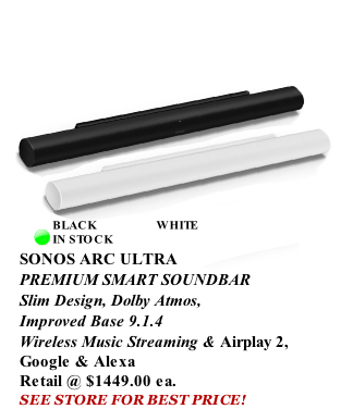 RADIOCRAFTS Proudly Canadian owned and operated Since 1941 Hours Of Operation: Monday - Saturday - 10:00am - 5:30pm SONOS SUB 4 PREMIUM WIRELESS SUBWOOFER Improved wireless connectivity Retail @ $1149.00 ea. SEE STORE FOR BEST PRICE! SONOS MINI SUB  BOLD BASS Wireless Retail @ $649.00 ea. SEE STORE FOR BEST PRICE! Sub Mini.pdf WHITE WHITE SONOS ROAM 2 PORTABLE SPEAKER Wireless Music Streaming, Airplay 2, Bluetooth, Google & Alexa Water proof, 10 Hour Battery Charge Retail @ $229.00 ea. SEE STORE FOR BEST PRICE! BLACK IN STOCK WHITE Era 100.pdf SONOS ERA 100 EFFORTLESS LISTENING, Bluetooth Wireless Music Streaming & Airplay 2, Alexa Retail @ $289.00 ea. SEE STORE FOR BEST PRICE! BLACK IN STOCK Beam (Gen 2).pdf SONOS BEAM 2 HIGH DEFINITION SOUND Dolby Atmos, Wireless Music Streaming Airplay 2, Google & Alexa Retail @ $649.00 ea. SEE STORE FOR BEST PRICE! BLACK IN STOCK Five.pdf SONOS Five STUDIO QUALITY Wireless Music Streaming & Airplay 2, Retail @ $779.00 ea. SEE STORE FOR BEST PRICE! WHITE BLACK SONOS BLACK IN STOCK Era 300.pdf SONOS ERA 300 EFFORTLESS LISTENING, Bluetooth Wireless Music Streaming & Airplay 2, Alexa Retail @ $629.00 ea. SEE STORE FOR BEST PRICE! WHITE BLACK IN STOCK SONOS ACE ACTIVE NOISE CANCELLING HEADPHONES 30 hour battery life Retail @ $549.00 ea. Sale Price: $399.00 ea. (BLACK ONLY) March 16, 2026- April 6, 2026 BLACK WHITE IN STOCK WHITE Port.pdf SONOS PORT CONNECT EVERYTHING Wireless Music Streaming & Airplay 2, Retail @ $649.00 ea. SEE STORE FOR BEST PRICE! Amp.pdf SONOS AMP POWER EVERYTHING 125W/Ch Retail @ $1049.00 ea. SEE STORE FOR BEST PRICE! IN STOCK SONOS ROAM WIRELESS CHARGER Charge your portable speaker with this custom-designed magnetic wireless charger. Retail @ $69.00 ea. SEE STORE FOR BEST PRICE! IN STOCK SONOS LINE-IN ADAPTER CABLE 3.5mm to USB-C adapter Retail @ $24.99 ea. SEE STORE FOR BEST PRICE! SONOS ERA 100 WALL MOUNTS Retail @ $159.00 /PAIR SEE STORE FOR BEST PRICE! SONOS ERA 300 WALL MOUNTS Retail @ $179.00 /PAIR SEE STORE FOR BEST PRICE! SONOS BEAM MOUNT Retail @ $79.00 ea. SEE STORE FOR BEST PRICE! SANUS AMP MOUNT For Sonos Amp Retail @ $89.00 ea. SEE STORE FOR BEST PRICE! IN STOCK SONOS ARC ULTRA MOUNT Retail @ $89.00 ea. SEE STORE FOR BEST PRICE! IN STOCK SONOS ERA 100 SPEAKER STANDS SET OF TWO H - 35.5”, W - 10 Ibs Retail @ $349.00 /PAIR SEE STORE FOR BEST PRICE! SONOS ERA 300 SPEAKER STANDS H - 37.64”, W - 10.36 lbs Retail @ $379.00 /PAIR SEE STORE FOR BEST PRICE! IN STOCK BLACK IN STOCK IN STOCK IN STOCK IN STOCK SONOS BEAM 2 & SUB MINI BUNDLE DEAL! Retail @ $1298.00 ea. SEE STORE FOR BEST PRICE! BLACK IN STOCK SONOS PLAY PORTABLE SPEAKER Wireless Music Streaming, Bluetooth Airplay 2, Voice Control Water Proof & Drop-resistant  Bluetooth, 24 Hour Battery Life Includes Charging Base Retail @ $399.00 ea. BLACK WHITE SONOS MOVE 2 PORTABLE SPEAKER Wireless Music Streaming, Bluetooth Airplay 2, Google & Alexa,  Bluetooth, 24 Hour Battery Life Includes Charging Base Retail @ $649.00 ea. SEE STORE FOR BEST PRICE! WHITE BLACK IN STOCK